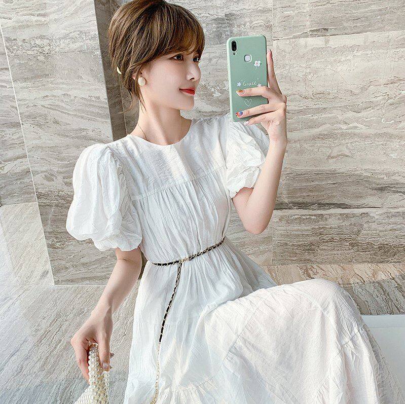歇瘦连衣裙女坚果褶皱2021茶夏季新款泡泡袖白色服饰法式仙女裙热门设计联盟服务商